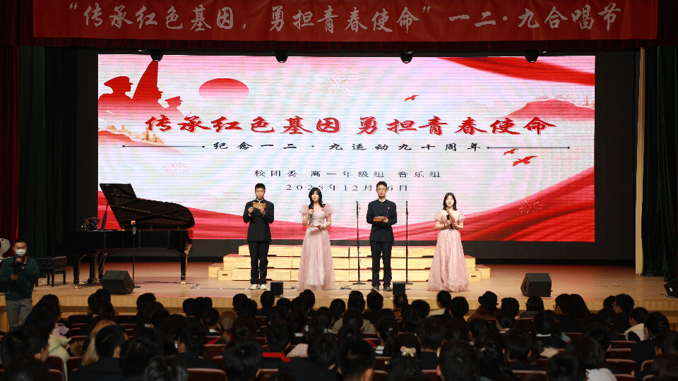 为纪念“一二・九”运动 90 周年,传承和弘扬爱国主义精神,引导广大青年厚植家国情怀,我校举办 “传承红色基因 勇担青春使命”纪念 一二・九运动 90 周年合唱节。校党委书记田军、副校长梁原草、副校长李华艳、校长助理徐兰出席了活动。艺术组齐宏老师、周红苇老师、刘奕菲老师、倪蕾老师、孟红岩老师、张晶老师、苏静敏老师担任本次活动的评委。本次比赛由校团委主办、高一年级组和艺术组承办,高一年级全体师生齐聚礼堂,用嘹亮的歌声回望峥嵘岁月,礼赞伟大时代。