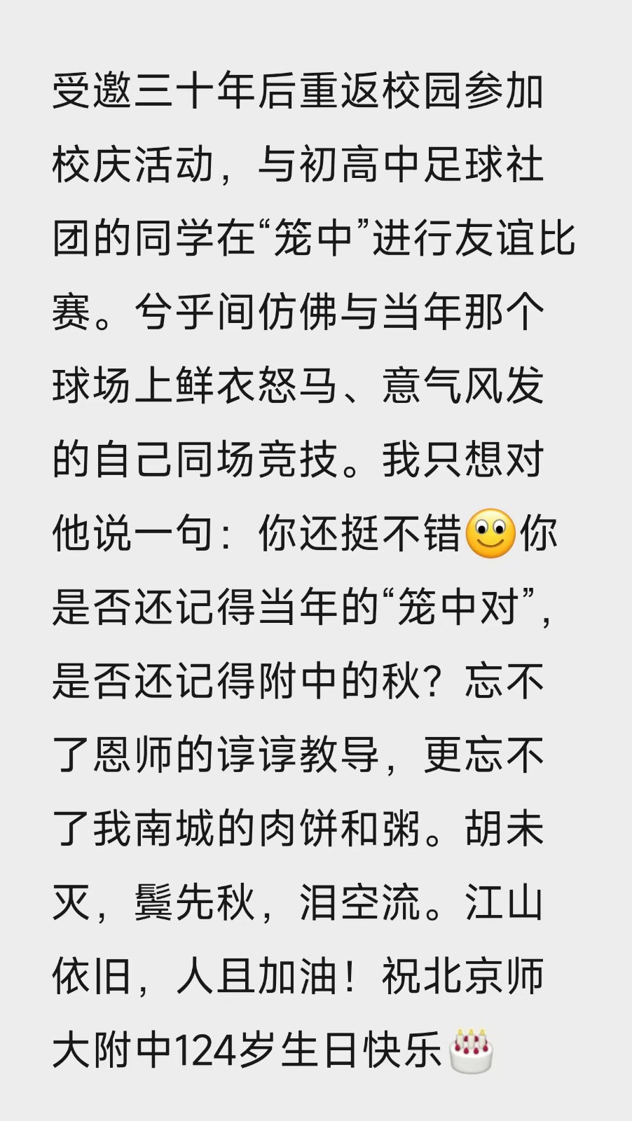 比分与胜负已不是这场比赛的目的。绿茵场上最动人的,是奔跑时脚下响起的青春回音,是传球间心中流转的默契记忆。校友足球队与在校生足球队的体能虽有差异,但对足球的热爱如出一辙。这不仅仅是一场竞技,更像是一次穿越时光的对话——与那个十七岁的自己,在同一片场地上重逢。那些被岁月深藏的校园记忆,在此刻被轻轻唤醒;那份曾沸腾于青春的赤诚热血,再一次为这片绿茵场澎湃如初。