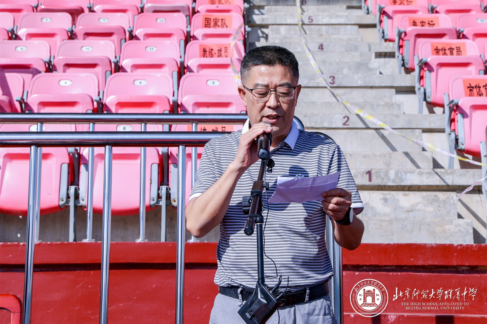 随后,王校长介绍学校体育佳绩:田径队包揽西城区初高中团体冠军,初中更是实现三连冠,还在市级、全国赛事中斩获多枚奖牌;健美操队、初高中女篮也在各级比赛中表现亮眼,培养出多名一级、二级运动员。“这不仅是速度与力量的较量,更是意志与品格的锤炼”。最后,王校长期望学子们发扬 “友谊第一,比赛第二” 的精神,在竞争中学会尊重、在拼搏中收获成长,以奋进姿态致敬历史、开创未来。