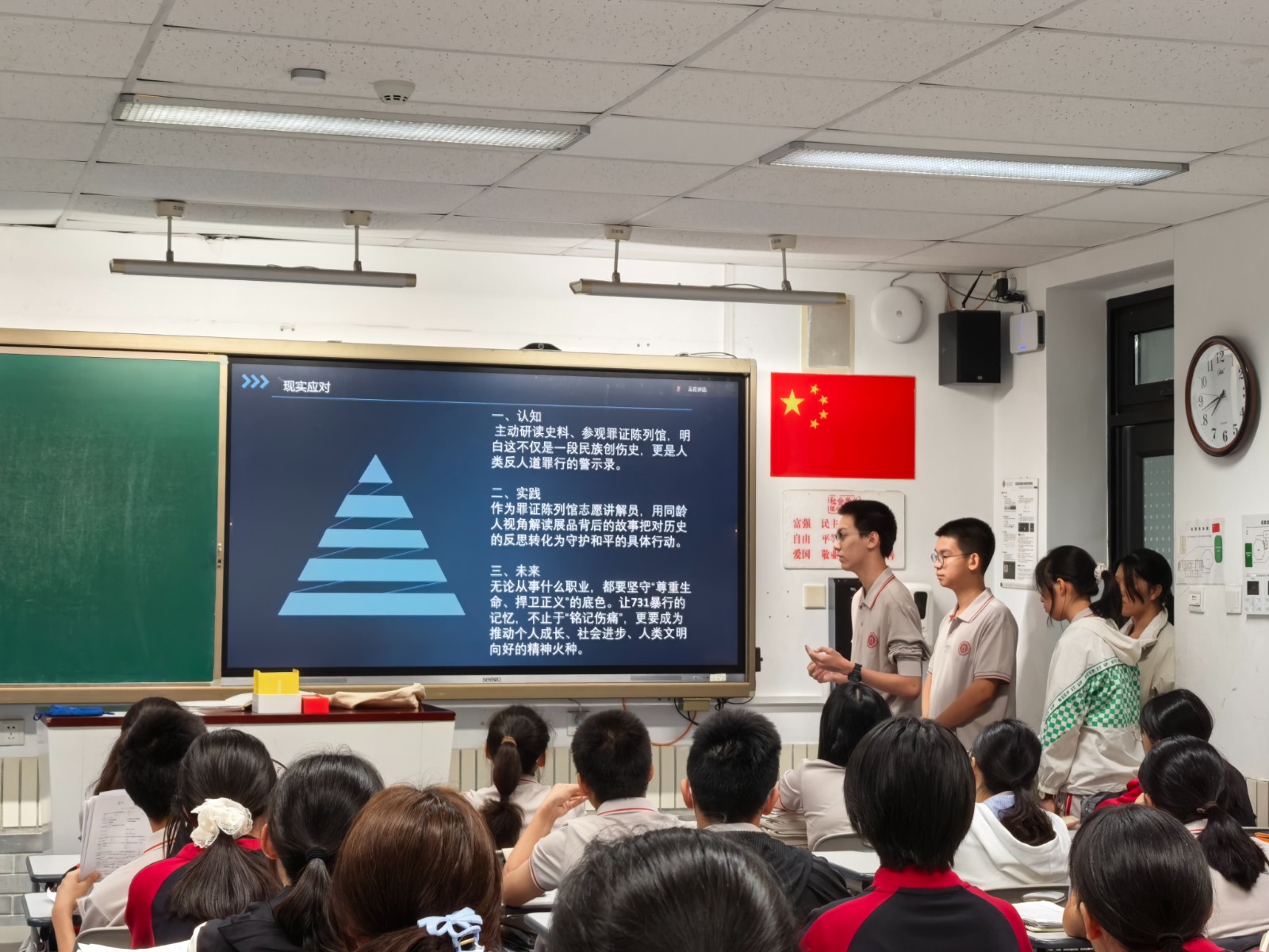 观影结束后,班级开展了交流分享会。历史教师结合影片内容进行现场解读,指出影片通过小人物的命运沉浮,串联起 731 部队的罪恶生态,碎片化的叙事手法恰恰是对历史真相的精准还原,帮助学生更全面、深入地理解那段历史。在班级讨论环节,高一(2)班学生李同学动情地说:“影片里反抗者在至暗时刻坚守良知的模样让我深受震撼,他们的勇气就是民族精神最鲜活的底色。” 高一(5)班的王同学则谈到:“同步观看这部电影,让我觉得自己与这段历史的距离更近了。我们铭记苦难,不是为了延续仇恨,而是要时刻警惕否认历史的行为,守护来之不易的和平。”