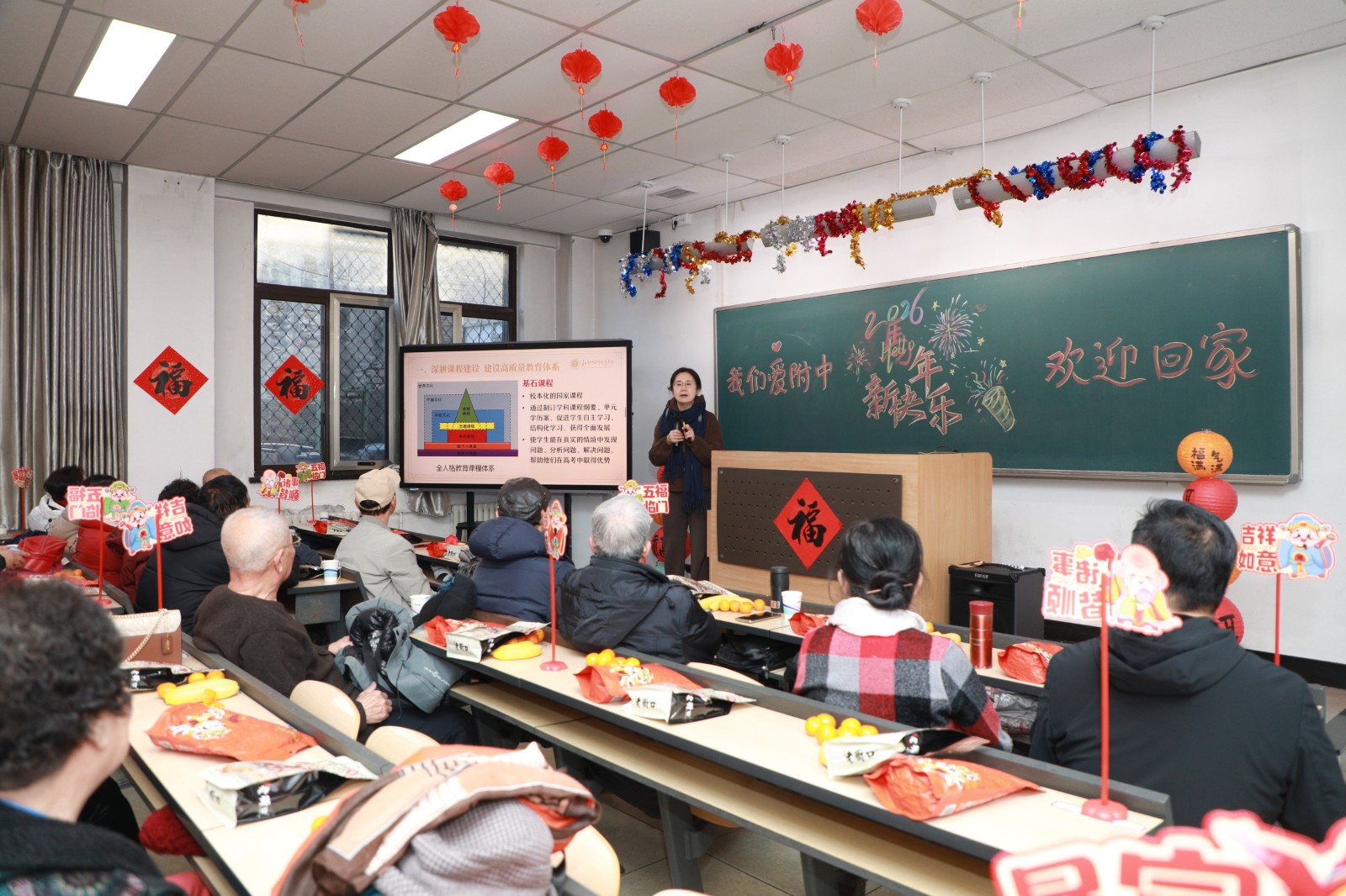 王莉萍校长、田军书记亲临活动现场,向全体离退休教师致以亲切的新年问候,并对各位老同志长期为学校发展打下坚实基础表示衷心感谢。王莉萍校长详细汇报了学校近年来的发展成就与未来规划,田军书记表达了对老教师们的崇高敬意和深切问候,并深情寄语:“欢迎各位老师常回‘家’看看!”。