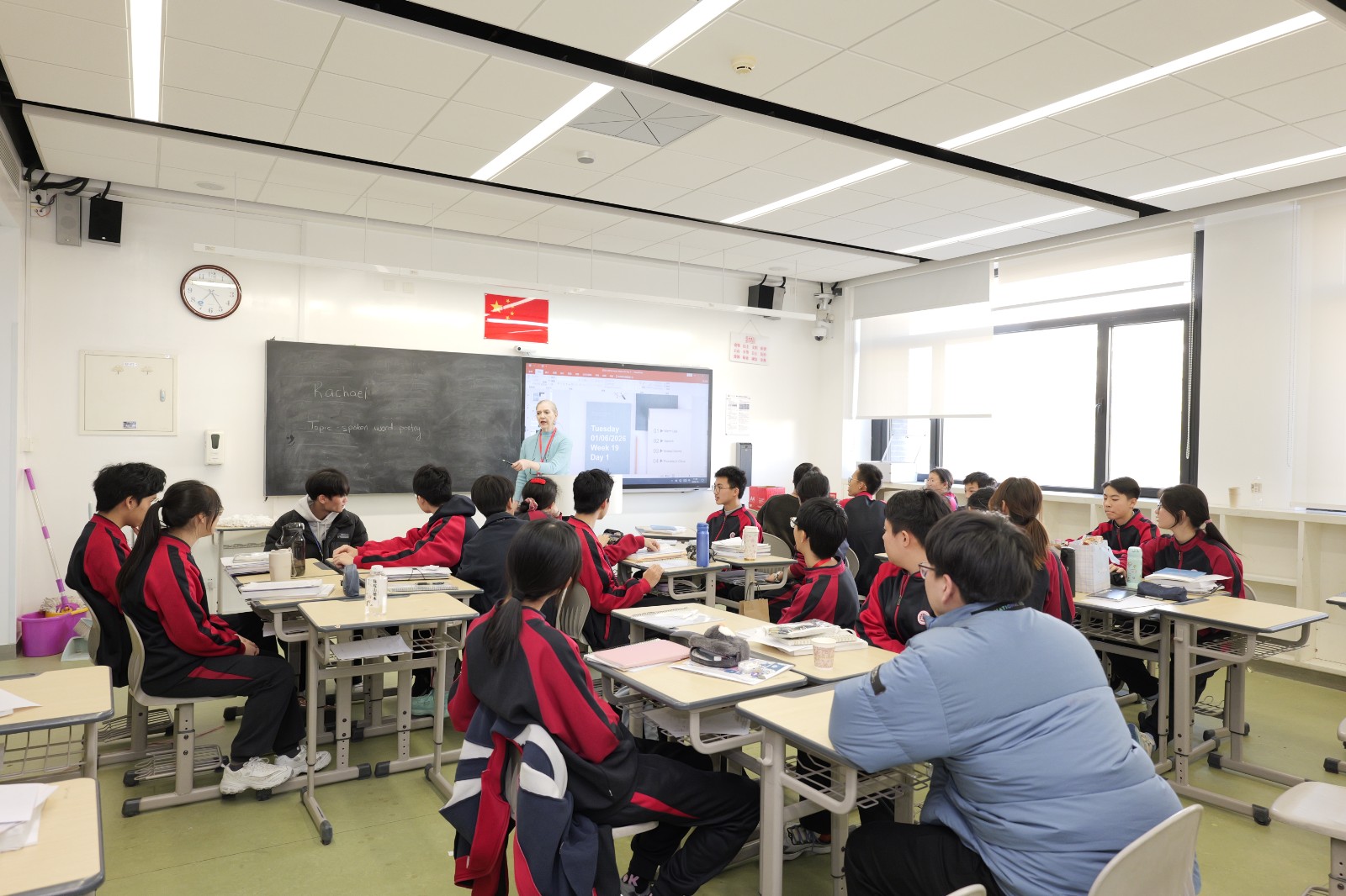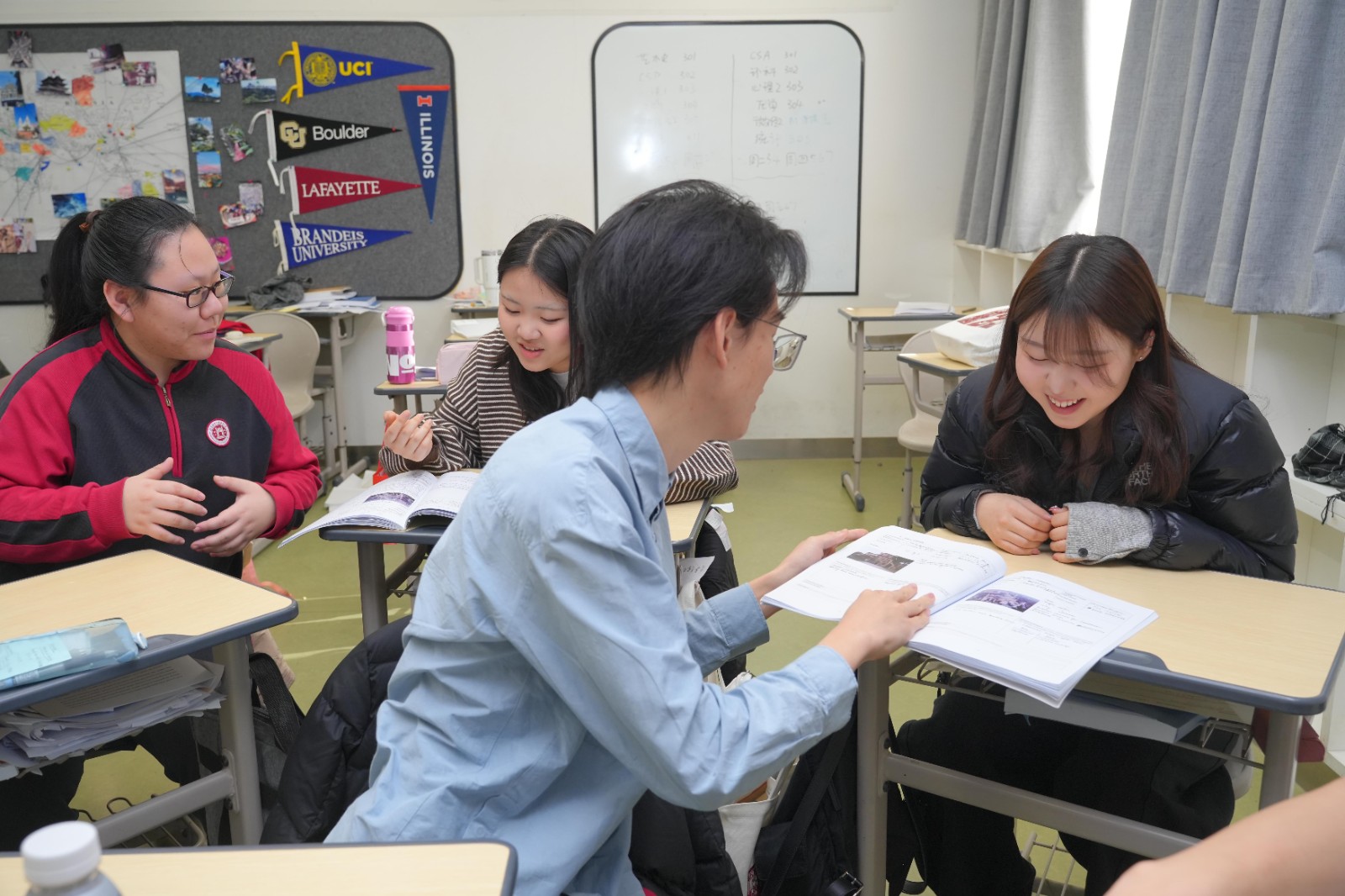 在AP环境科学课上,韩国学生与中国同学结对而坐,共同研读课程资料,并就空气污染这一主题进行了深入交流。讨论环节,师生们围绕污染来源与北京冬季的治理措施畅所欲言。韩国同学们因熟练掌握三门语言,其出色的语言能力让外教Summer老师印象深刻,他们本人也以其扎实的素养,成为了在场师生学习的榜样。