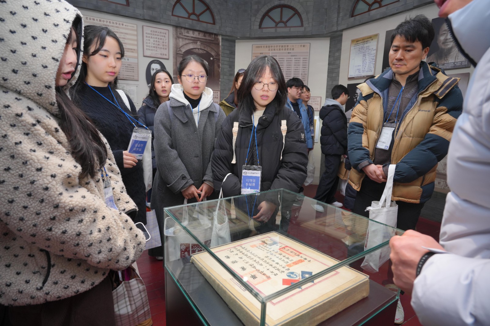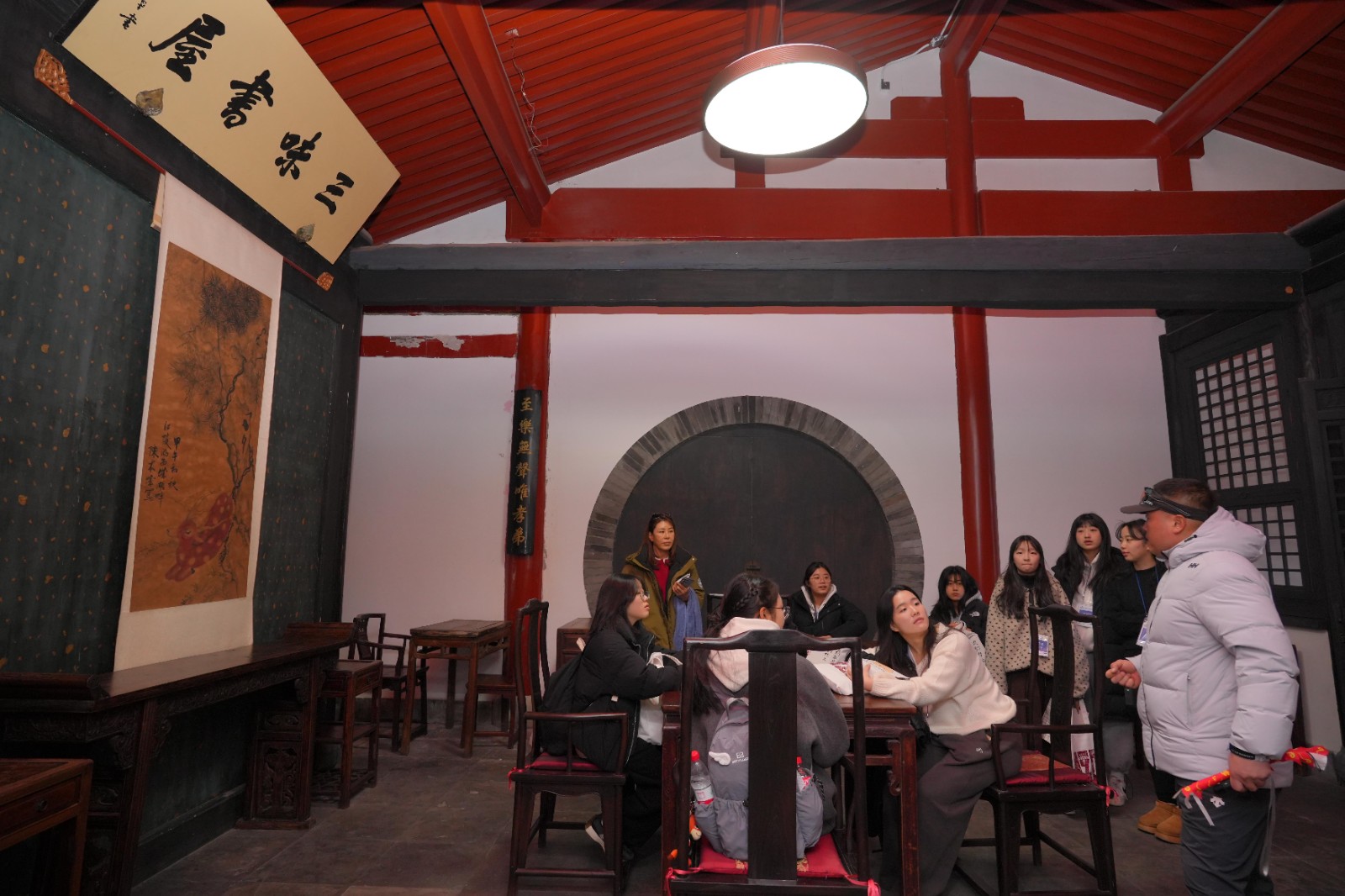 初入校园,杏坛屋舍的墙上悬挂的教育家画像诉说着传承已久的治学之道。韩国同学们初见蒲团,纷纷落座拍照留念,随行的李博舒婕老师笑着讲解:“在古代私塾里,大家可是要跪坐聆听先生授课的。”同学们立刻效仿,沉浸式体验了中国传统的师生相处之道。行至三味书屋,大家驻足了解鲁迅先生的求学往事。