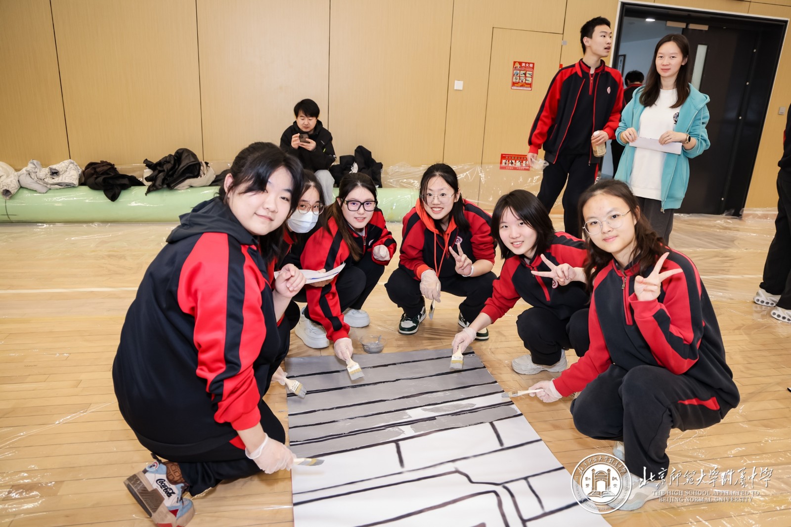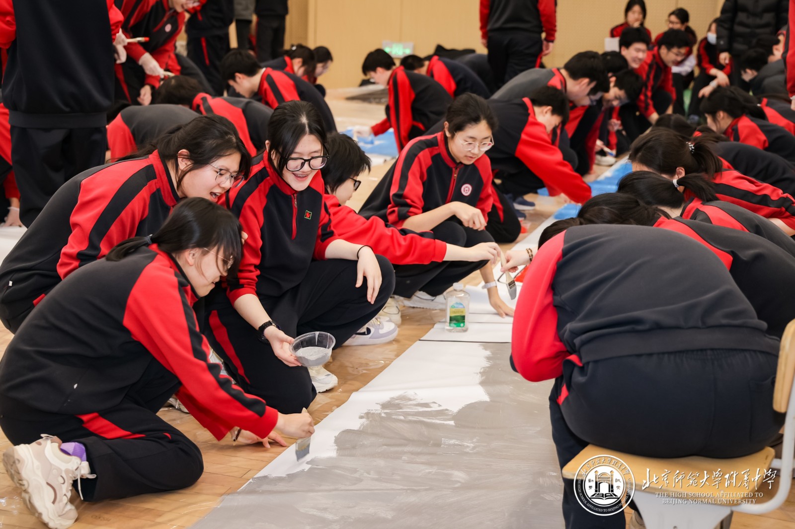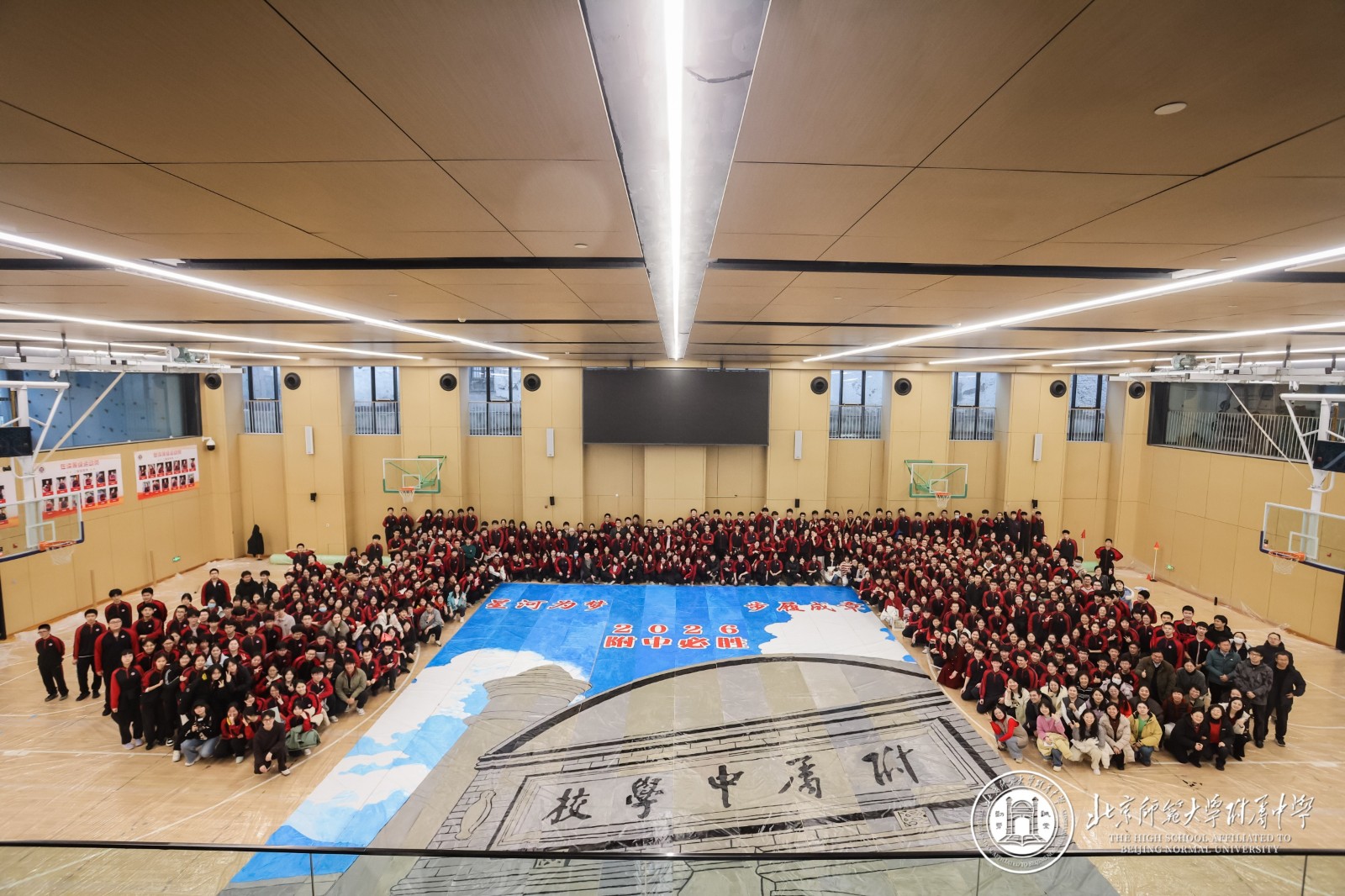 大会起始阶段,12个班级的师生在西区篮球馆携手完成了主题为“星河为梦,步履成章”的“纳斯卡巨画”集体创作 。当巨幅画卷在体育馆中心拼接铺展,“2026·附中必胜”的字样在灯光下熠熠生辉,强烈的视觉震撼瞬间点燃全场热情 。年级组长周晓明老师表示,这不仅是艺术创作,更是500多颗心的凝聚,500多名师生信念的展现,每一道笔触都刻下了冲刺的誓言 。