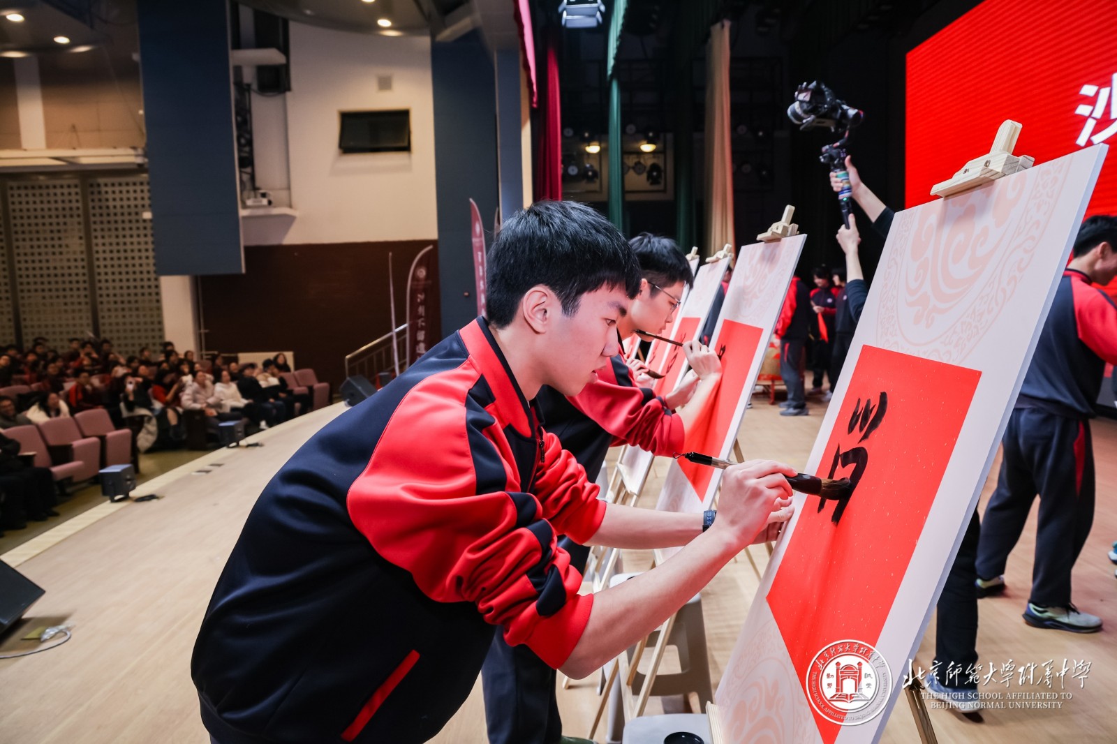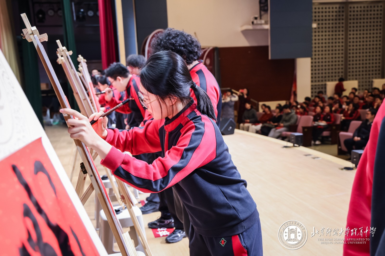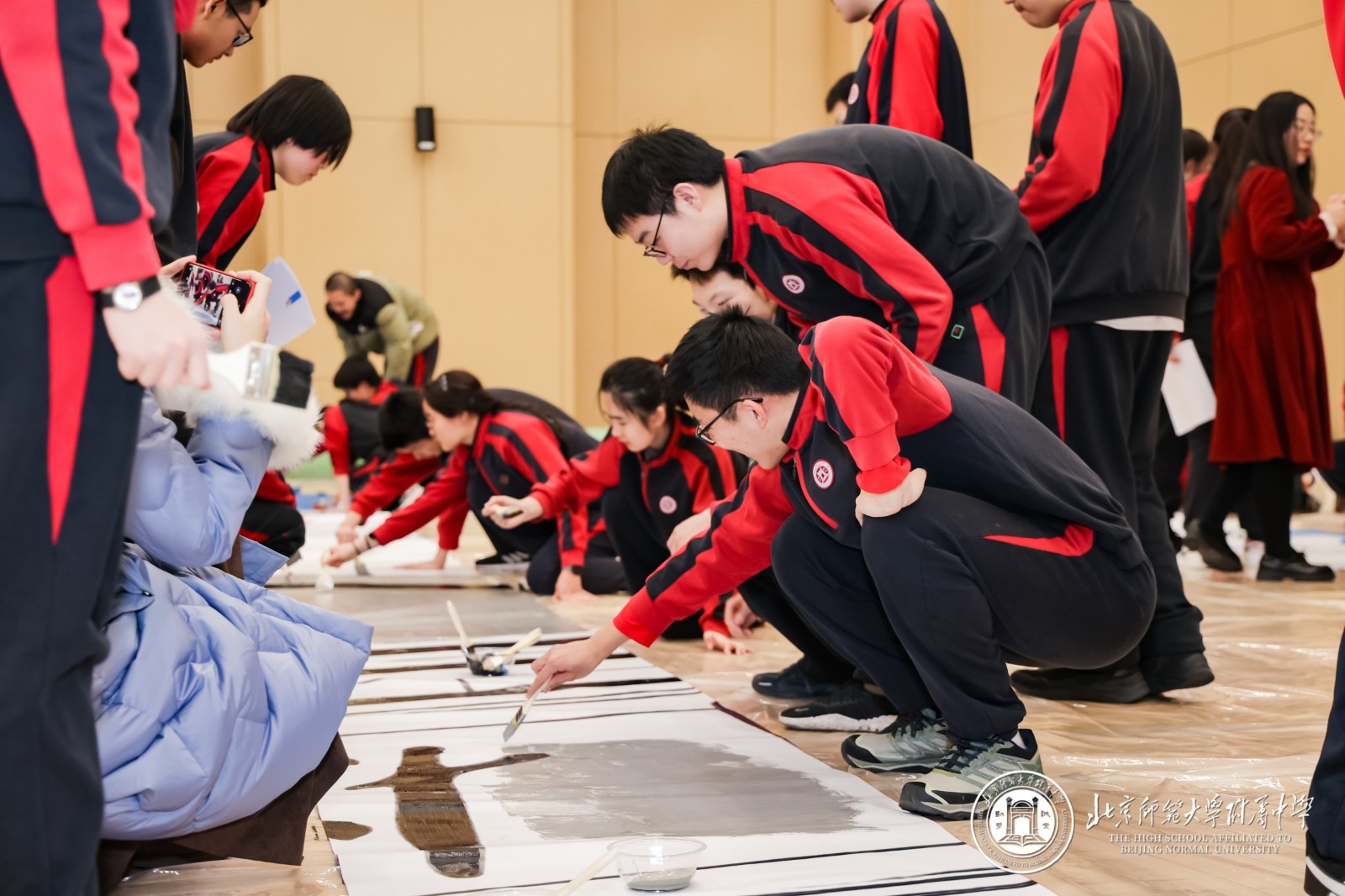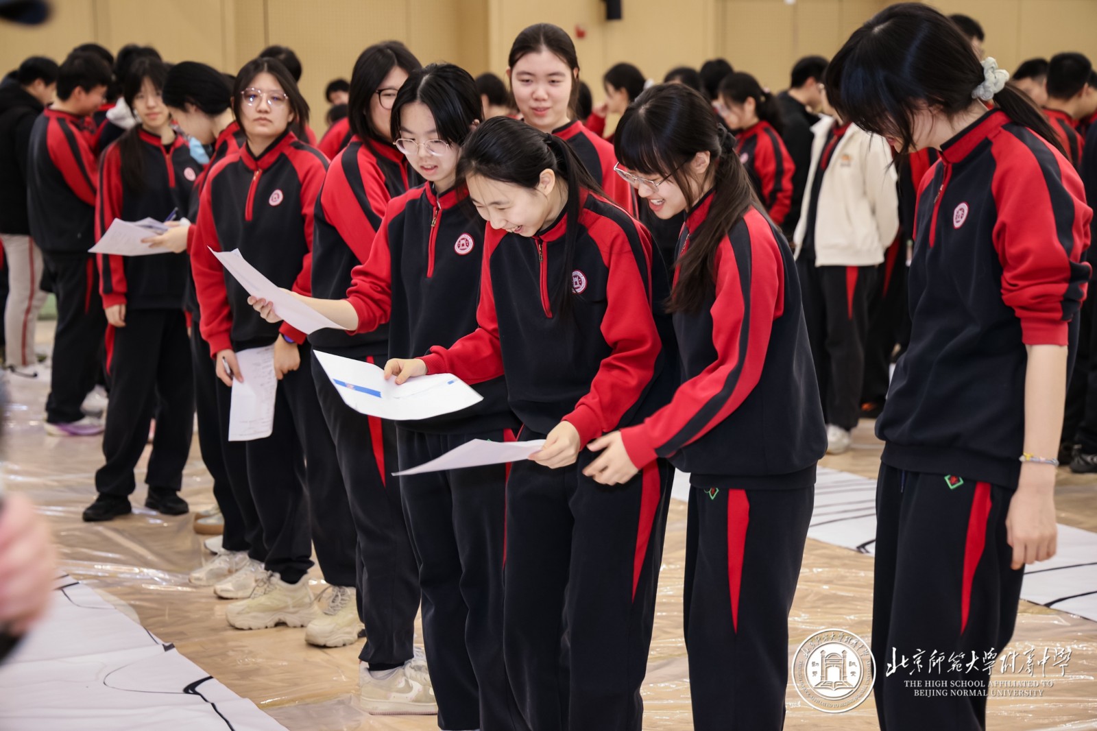 大会起始阶段,12个班级的师生在西区篮球馆携手完成了主题为“星河为梦,步履成章”的“纳斯卡巨画”集体创作 。当巨幅画卷在体育馆中心拼接铺展,“2026·附中必胜”的字样在灯光下熠熠生辉,强烈的视觉震撼瞬间点燃全场热情 。年级组长周晓明老师表示,这不仅是艺术创作,更是500多颗心的凝聚,500多名师生信念的展现,每一道笔触都刻下了冲刺的誓言 。