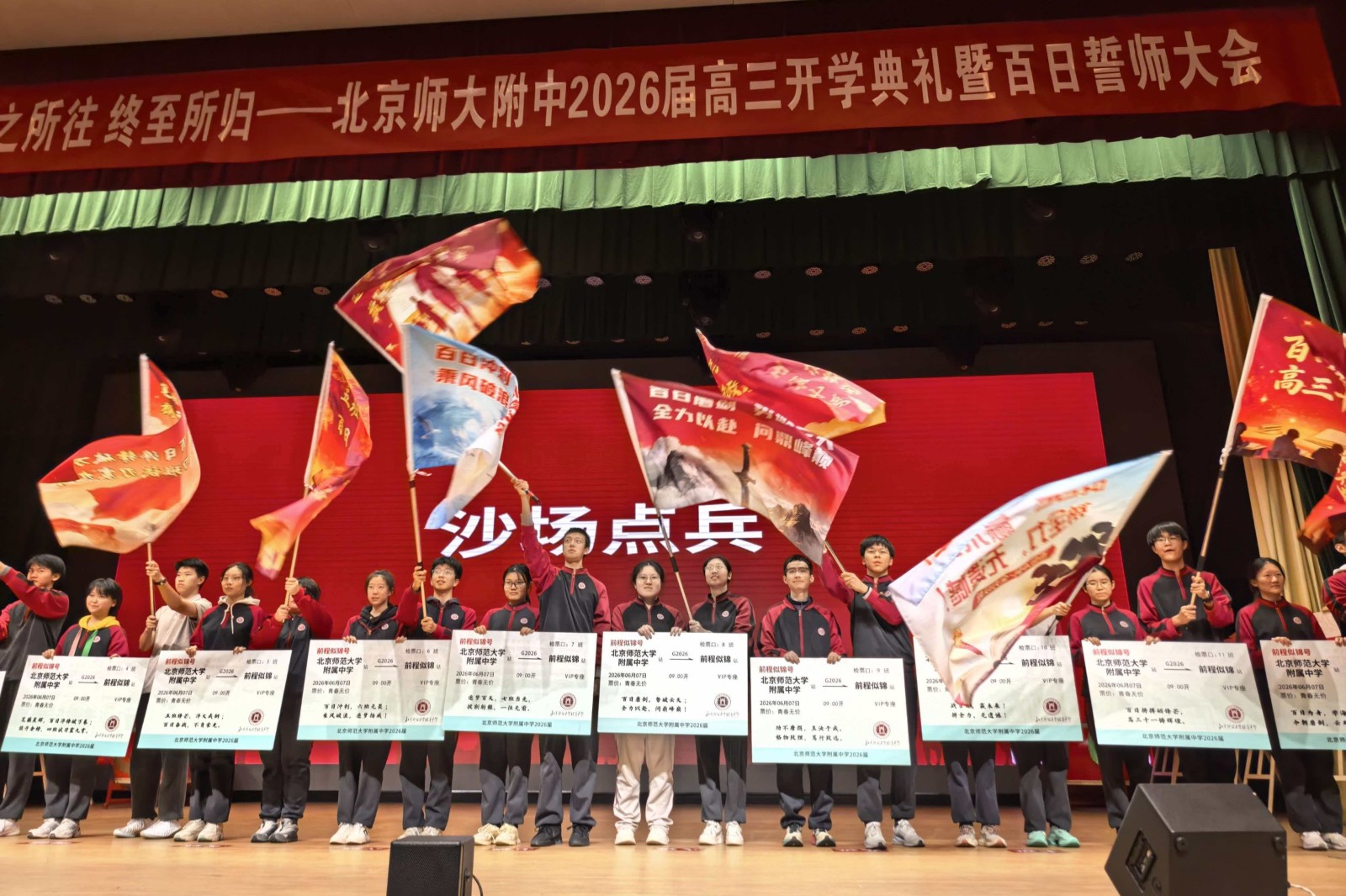 随后,王校长与田军书记为各班授予战旗并派发“逐梦车票” 。伴随着激昂的鼓声,各班学生代表激情写下“战”字,12个班级依次起立,大声喊出班级誓言。最后,在周晓明老师的带领下,高三全体同学齐声宣誓,排山倒海的口号声将大会气氛推向顶点。各学科老师和校领导们也送上了暖心的百日寄语 ,为所有学生注入满满的动力。
