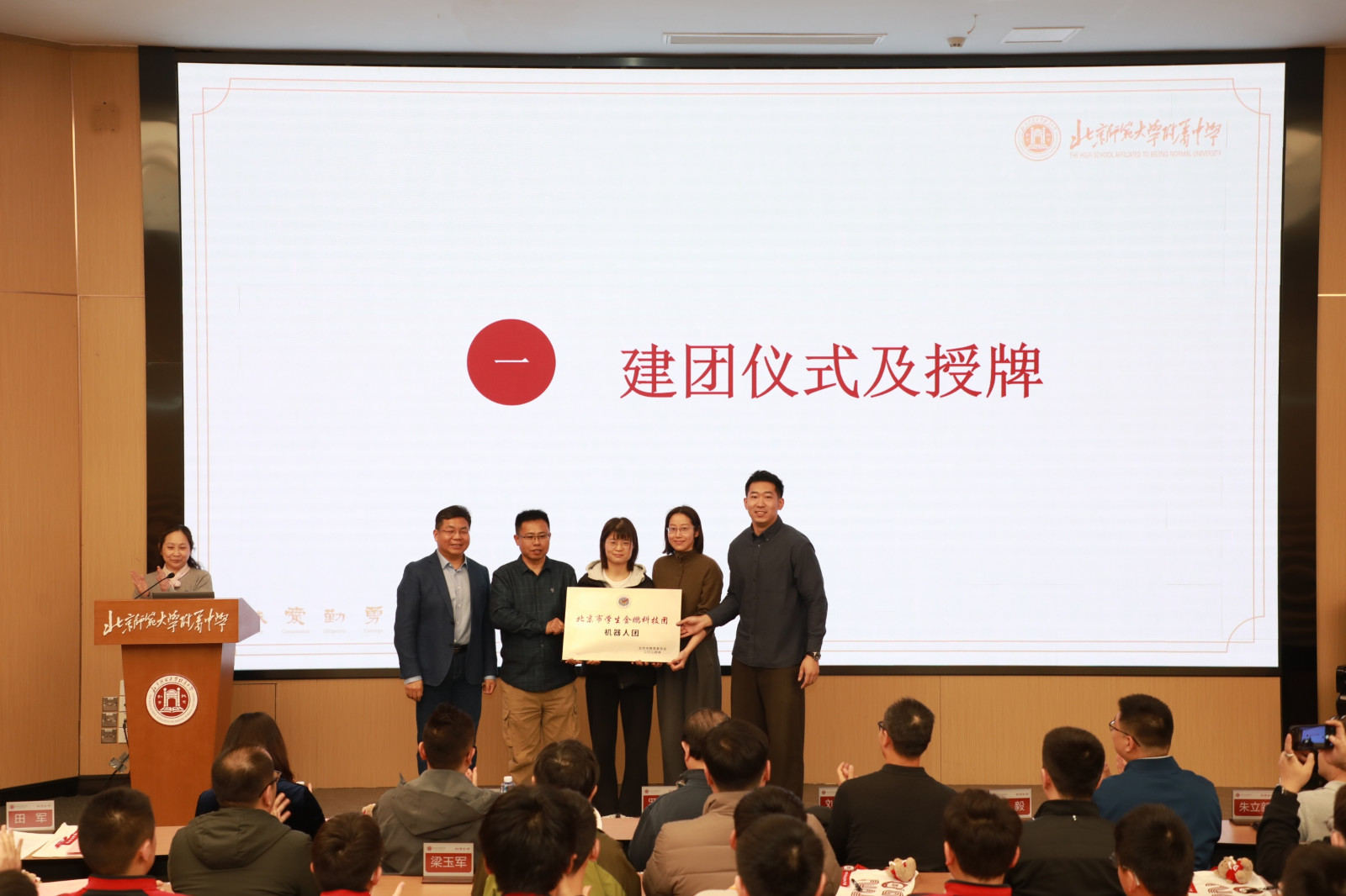 顾校长回顾了学校金鹏团发展、申报的历程,宣布北京师大附中金鹏团机器人分团建团,田书记授牌,标志着我校机器人教育步入高质量发展的新阶段。